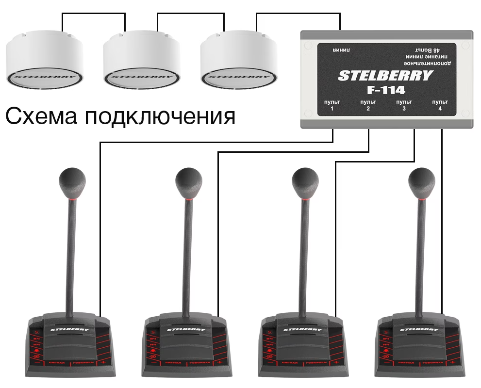 - Возможность производить аудиотрансляцию и громкие объявления с любого из однозонных пультов STELBERRY серии F
