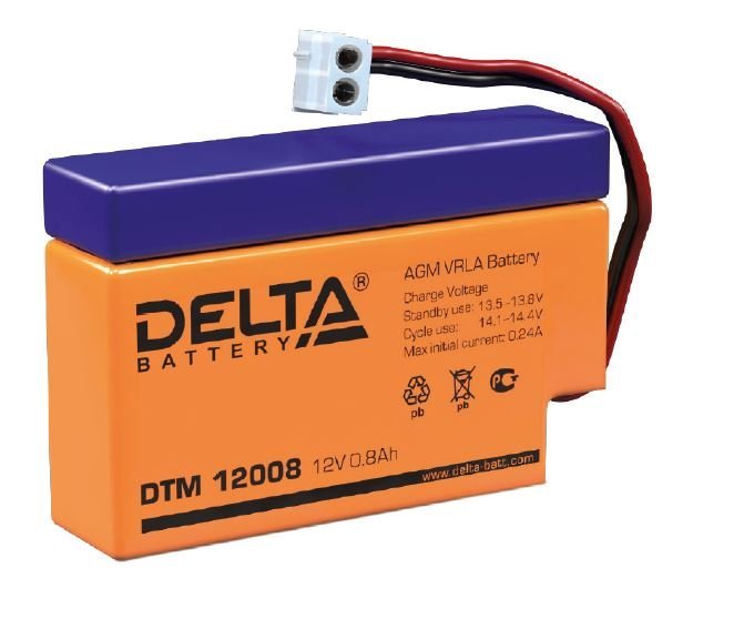 Герметизированный VRLA cвинцово-кислотный аккумулятор Delta DTM 12008 напряжением 12В и емкостью 0.8Ач изготовлен по технологии AGM (с микропористым заполнителем, пропитанным электролитом). Корпус изготовлен из негорючего ABS пластика. Срок службы аккумулятора достигает 6 лет. Аккумулятор предназначен для работы в режиме постоянного подзаряда (буферный режим) или в режиме разряд-заряд (циклический режим). Обладает низким внутренним сопротивлением и саморазрядом. Дополнительно к аккумулятору у нас можно подобрать для него зарядное устройство.